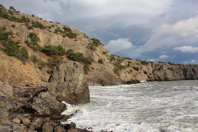 Предварительно узнав расписание на Судак, позавтракав, вышли на трассу ждать автобус. Буквально через 20 мин сели в заветный автобус Севастополь – Судак. В Морском на автостанции была остановка на 20 мин, за это время успели погулять по берегу моря, побегать от огромных волн.