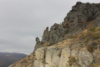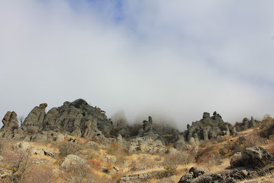 Не завтракаем, пьем чай с печеньем и идем в долину привидений. На градуснике 0. Карен решил остаться в лагере, но и ему скучать не пришлось, дядя Миша развлекал его рассказами, что о нем даже в интернете пишут )) Спустившись через лес на тропу, стало теплее, сняли куртки и теплые штаны. Открывается вид на фрагмент долины. Долина привидений находится на территории заповедника, вход платный – 15 грн взрослый, 10 грн детский. Мужчина на входе предлагает нам рассказать о долине, слышу знакомые аккорды, играет мэрилин мэнсон на телефоне. Мужчина предложил нам пройти по детским билетам. Пошли по маркированной тропе, в самом начале – камень на котором танцевала Нина в Кавказской пленнице, и Никулинский орех, залезать на который запрещено ввиду аварийного состояния. Далее тропа уводит нас вверх, открывая виды на Долину. Несколько фотографий на фоне возвышающегося Великана. Решаем идти по тропе вверх, позавчерашний день меня изрядно вымотал, тяжело идти даже без рюкзака. Влад терпеливо меня ждет и идет рядом. Сначала мне подниматься совершенно не хотелось, но сверху открываются такие виды, которые снизу не увидеть, оно того стоит. Отсюда видно всю долину, причудливые формы скал, которые напоминают людей, животных, ведь не зря зовутся «привидениями». Видно на горизонтах Алушту и Чатырдаг. Всегда хотела увидеть долину в облаках, но в этот раз очень хотелось теплого солнца. Погода решила удовлетворить оба моих желания.
