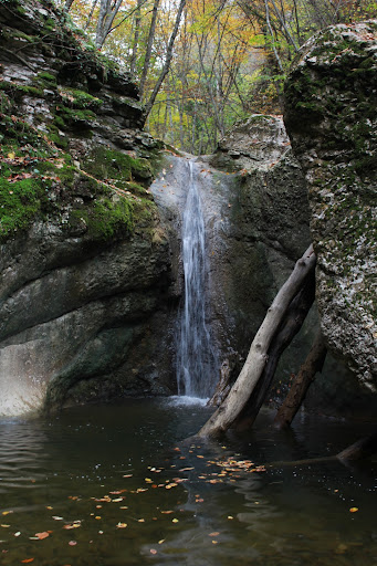 Проснулись под хрюканье, свинки искали пропитание у нас на стоянке. Приготовили овсянку со сгущенкой, выдвинулись в путь. Наш сегодняшний маршрут проходил вдоль каньона Кучук-Карасу по речке. Вдоль ущелья, окруженного буковым лесом, течет речка, образуя небольшие водопады и водные ванночки. По пути встречаются поваленные деревья, некоторых из них напоминают разные фигуры, чью-то гигантскую ногу или пасть крокодила. Погода хоть и пасмурная, но приятная, безветренная. В этот день мы встретили три группы туристов. Остановившись у водопада, скинули вещи, решили прогуляться по месту, сделать несколько фотографий, времени у нас было много. Влад решил пойти сделать несколько фотографий, поскользнувшись на мокрых листьях, принял еще один утренний душ))) Со стороны это выглядело забавно, только после этого Владу пришлось тащить на себе кучу мокрых вещей, которые высохли только к концу похода. Обсуждали тогда, что жаль нет фотки, однако как потом оказалось, кто-то случайно подловил сей момент, того не подозревая. Чуть выше по течению, речка образует еще несколько безымянных водопадов. Водопад обходили по склону, по проложенной лесенке из деревянных бревен и натянутых кем-то проволок. Начал моросить дождь и в уютном месте под скалой мы решили сделать остановку на обед. Тут у меня полностью оторвалась подошва от одного ботинка.. Засада! Пришлось обувать кроссовки. До стоянки оставалось пройти еще немного. Оставив Валика с рюкзаками, пошли искать место под стоянку, прошли до дороге достаточно много, но ничего не нашли, вернулись обратно. Тем временем начал идти достаточно частый дождь. Встали недалеко от реки. Поставили быстро палатки, натянули тент и ребята занялись костром, который все никак не получалось развести из-за влажности. Кто-то предложил выпить коньяк «за костер», пить не хотела, но выпила, чтоб потом не говорили, что из-за меня не получилось ))) Выпила не зря! Вскоре получилось развести заветный костер. Это был самый огромный наш костер за весь поход.