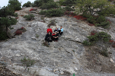 Прибыли в 6 утра в Симферополь. Дубак. Градусник показывает +2. В двух штанах холодно… Покупаем билеты на Богатое. Дорога заняла нескольким более часа. В Богатом мы были около 8 утра. Погода пасмурная и унылая, вокруг ничего примечательного не видно. Где-то на вершинах холмов облака. Позавтракали в кафешке советского типа, а на улице все такой же дубак. Пошла одеваться. Натянула велоштаны, сверху еще одни штаны, и сверху флисовые, вместо кроссовок - ботинки. Вроде тепло. Вот и начался наш поход. Возвращаясь до нужного поворота, идем сначала по шоссе, свернули на грунт, буквально через несколько минут первая остановка. Жарко! Снимаю с себя одни штаны.. Ребята тоже снимают лишние вещи. Идем дальше. Не успев толком ничего пройти, … далее опускаю подробности неспортивных занятий в походе.., раздеваемся еще больше. Снимаю велоштаны, батник, остаюсь совсем в легкой одежде. Не успев пройти, наверное, и час, дошли до озера и кто-то предлагает уже обедать. Достали горелку, кастрюлю, приготовили мивину, горячий чай. Подошел какой-то чувак и говорит «Территория охраняется фирмой» и просит нас уйти. Допиваем чай, собираемся, уходим, местный показал нам направление в сторону дороги. Вышли на проселочную асфальтированную дорогу, домов не видно, изредка проезжают машины и мотоциклы, пасутся коровы, а в далеке на горизонте виднеются горы в облаках. Местные женщины советуют нам переждать в лесу, т.к. дождь с гор скоро окажется над нами. Но, мы ко всему подготовленные, одеваемся в дождевики и похожие на M&M’s топаем дальше. Время идет, а дождя все нет. Раздеваемся. Видимо, это местные от скуки спорят между собой, оденемся мы или нет после их советов. Этот день оказался довольно легким, прошли еще немного и уже прибыли на нашу запланированную стоянку в Поворотном. Разбили лагерь на берегу речушки, на ужин решили приготовить плов, чтоб избавиться от бОльшего кол-ва продуктов. Влад тем временем пошел принимать холодный экспресс-душ в речке. Вечером к нам подошла женщина, сказав, что мы находимся на территории заповедника, попросила с нас 80 грн (10 за палатку и 10 с человека), ребята попросили у нее документы, на что женщина сказала, что с собой их нет и она придет утром. Утром так никто не пришел. Вечер мы провели в компании двух розовых хрюшек, которые неподалеку искали желуди, я их подкармливала хлебом, а ребята за ними гонялись =))) На градуснике около +8. Ночь была теплая.