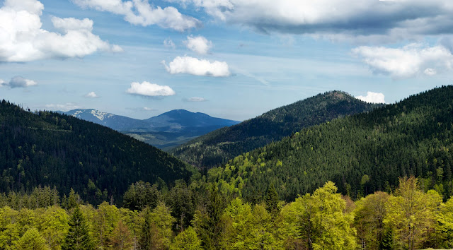 Первым делом мы решили пообедать на берегу речки. Дальше наш путь проходил через село, потом мы зашли в заповедную зону и уже наш путь был строго вверх. Шли по хорошо укатанной грунтовой дороге, знак нам поведал о подъеме в 3 км, уклоном 12%, знаки еще не раз нас предупреждали о последующих поворотах) странная дорогая, перекрыта шлагбаумами, а знаки стоят по всему пути. Уже сейчас нас начали радовать первые карпатские пейзажи.